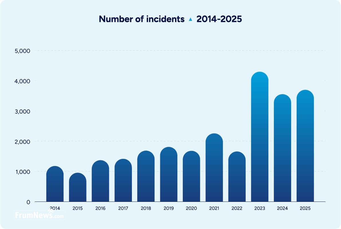 The Community Security Trust (CST) watchdog group reported that it recorded 3,700 anti-Semitic incidents in the UK in 2025, the second-highest total ever reported to CST in a single calendar year. This is an increase of 4% from the 3,556 anti-Jewish hate incidents recorded by CST in 2024, and 14% lower than the highest-ever annual total of 4,298 anti-Semitic incidents reported in 2023. CST recorded 1,662 anti-Semitic incidents in 2022 and 2,261 in 2021.