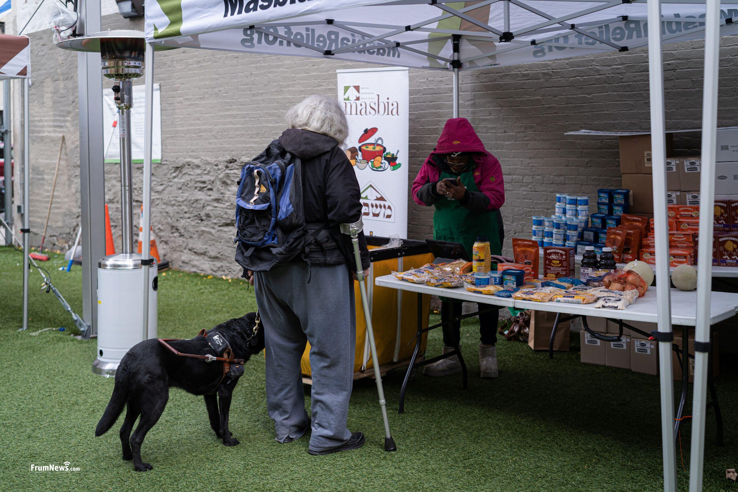 One of those showing up, at the beginning, was an elderly woman who arrived with her service dog. She told the Masbia staff that she was blind and needed help identifying each of the nearly 50 items we were giving out that day. The staff went through them one by one, slowly, patiently, and she chose what she felt she could manage to carry home in her knapsack. She made careful decisions as every item mattered. Even the 3-pound bag of onions, she asked to open so she could take only a few. But when she heard there was a pack of chicken, her face lit up. That was the item she was most excited to bring home.