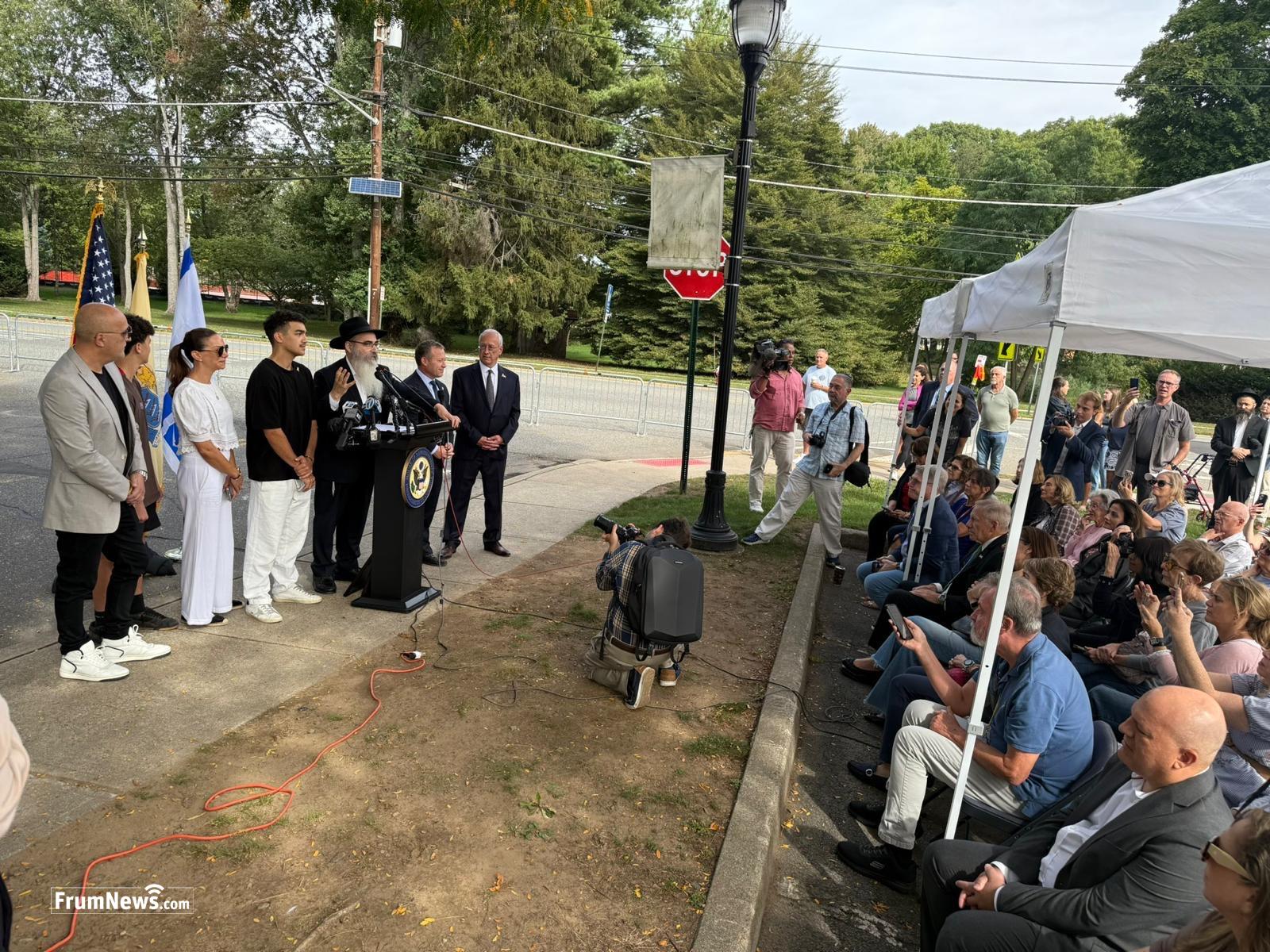 Flanked by Shluchim and Rabbis from Chabad Lubavitch, Eden along with many attendees proudly put Tefillin on. The dedication honoring of “Edan Alexander Way” took place today at borough hall, with Congressman Josh Gottheimer, Mayor Mark Zinna, elected officials, activists, relatives, friends and local residents were in attendance. The road leading into the municipal parking lot now bears Edan Alexander’s name.