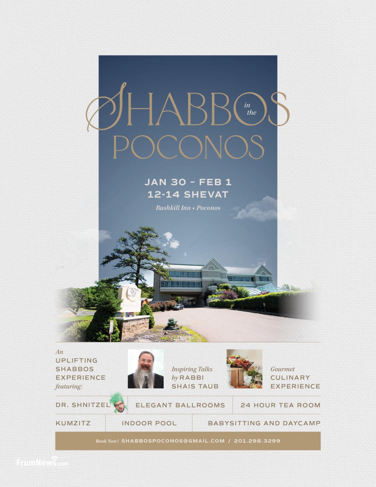 Whether you’re seeking a meaningful weekend getaway or looking to recharge, this Shabbaton will be spiritually enriching and deeply refreshing. For more information or to reserve your room, email ShabbosPoconos@gmail.com or call 201-298-3299.