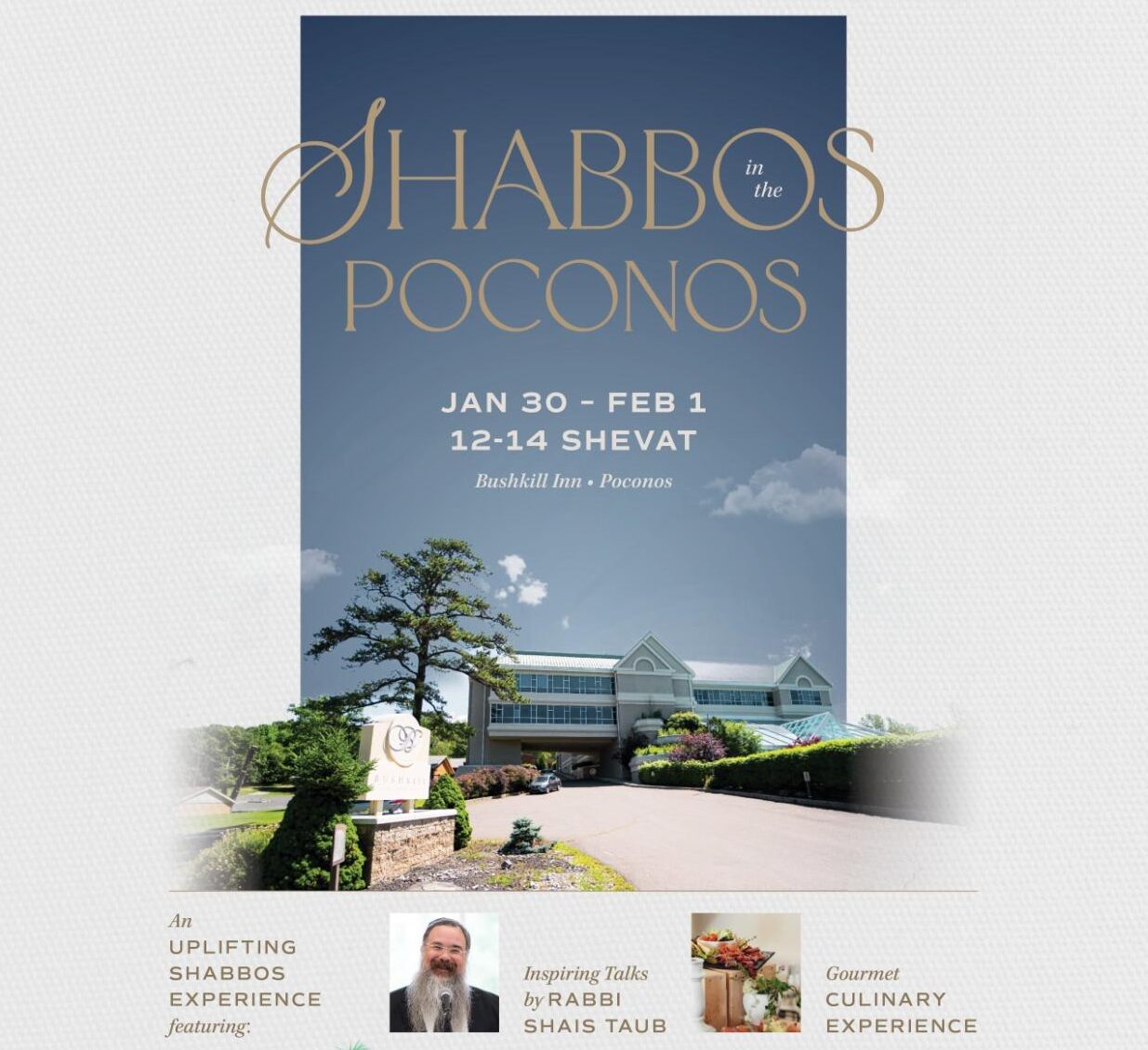 Guests will enjoy inspiring sessions with Rabbi Taub, Motzei Shabbos entertainment with Dr. Schnitzel, and a gourmet culinary experience throughout Shabbos.